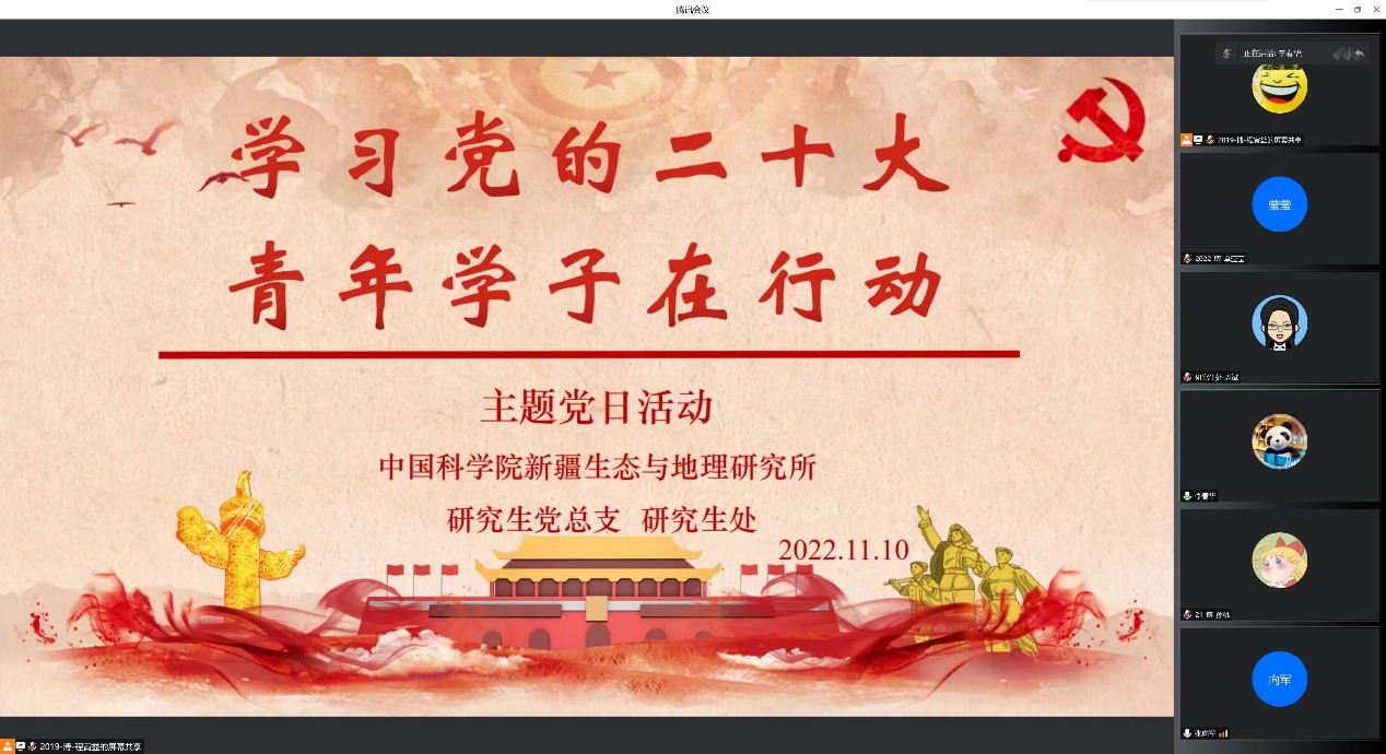 11月10日,中國科學院新疆生態(tài)與地理研究所研究生黨總支開展“學習黨的二十大,青年學子在行動”主題黨日活動,深入貫徹學習黨的二十大精神,研究所黨委書記、副所長張向軍作學習黨的二十大精神專題黨課,研究生黨總支書記李春華主持會議,全體研究生參加會議。