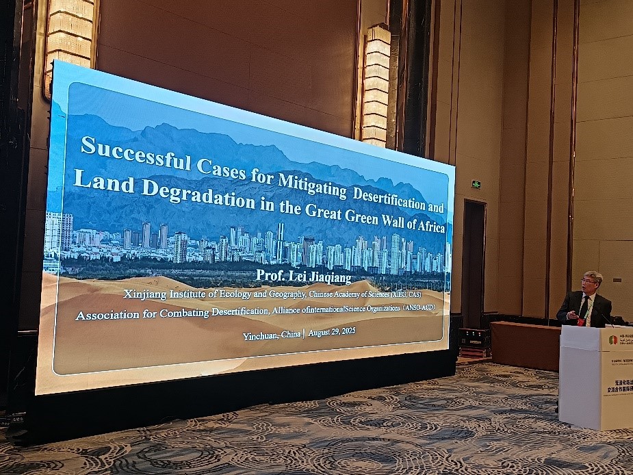 ????8月29日召開了“荒漠化防治交流合作國際研討會”。研討會由聯(lián)合國防治荒漠化公約秘書處,中國?中亞荒漠化防治中心,中阿干旱、荒漠化和土地退化國際研究中心、寧夏回族自治區(qū)林業(yè)與草原局與寧夏回族自治區(qū)科技廳聯(lián)合主辦,來自中國、巴林、沙特阿拉伯、毛里塔尼亞、埃及、阿爾及利亞、吉爾吉斯斯坦、尼日利亞、土庫曼斯坦、烏茲別克斯坦等11個國家的政府官員、高校和科研院所的專家學者及企業(yè)代表近200人參會。中外學者圍繞中阿荒漠化防治合作現(xiàn)狀、需求與機制展開了交流討論。雷加強研究員應邀作題為《緩解荒漠化和土地退化的成功案例——非洲“綠色長城”建設》的首場專家報告,系統(tǒng)介紹了“中國方案”及在非洲國家的示范和應用。報告以“問題—技術—成效—共享”為主線,用大量現(xiàn)場影像和數(shù)據(jù)重點展示了毛里塔尼亞“中-非綠色技術公園”示范區(qū)、埃塞俄比亞示范區(qū)的建設成效及階段性成果。UNCCD秘書處科學、技術和創(chuàng)新項目部官員為研究所頒發(fā)了證書和紀念杯,在聯(lián)合國防治荒漠化公約(UNCCD)成立30年之際,以此表彰研究所在非洲乃至全球防治荒漠化、土地退化和干旱(DLDD)方面持續(xù)進行且卓有成效的工作。