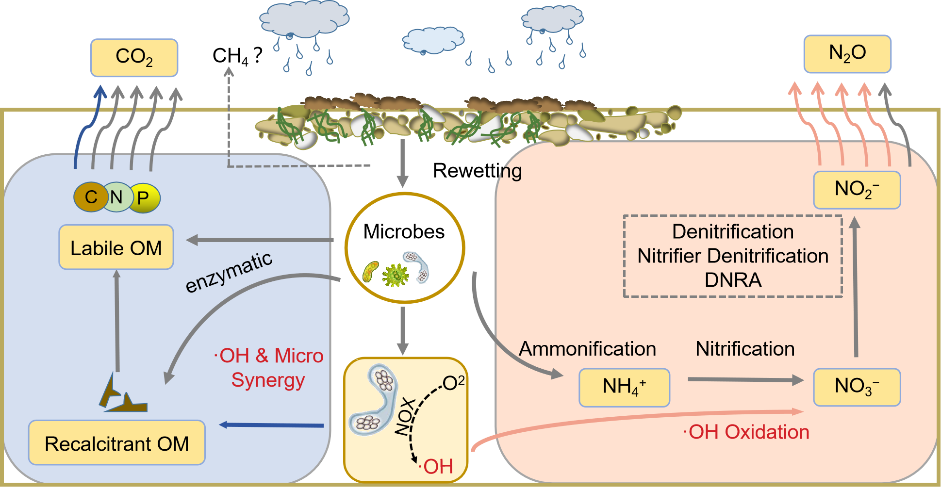 新疆生地所在Global Change Biology發(fā)文揭示了土壤復(fù)濕過程中羥基自由基(·OH)氧化作用對(duì)溫室氣體釋放的影響及作用機(jī)制
