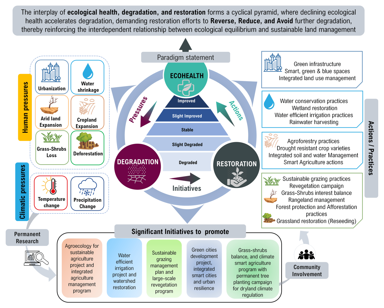 ????該研究為科學(xué)認(rèn)知轉(zhuǎn)化為區(qū)域可持續(xù)管理實(shí)踐奠定了基礎(chǔ),其核心是強(qiáng)調(diào)了因地制宜、精準(zhǔn)施策的重要性。研究成果為政策制定者提供了關(guān)鍵的循證框架,研究建議生態(tài)債務(wù)持續(xù)擴(kuò)大的國家,應(yīng)優(yōu)先在退化“熱點(diǎn)”地區(qū)實(shí)施干預(yù),避免損失加劇。不僅如此,研究提出的“土地平衡金字塔”管理模型(優(yōu)先避免新增退化>減緩現(xiàn)有退化>恢復(fù)已退化土地)為實(shí)現(xiàn)2030年旱地可持續(xù)管理目標(biāo)提供了清晰的行動路線圖。這一系統(tǒng)性評估不僅為學(xué)術(shù)界提供了知識框架,也為區(qū)域土地管理者和國際合作組織提供了決策依據(jù) 。