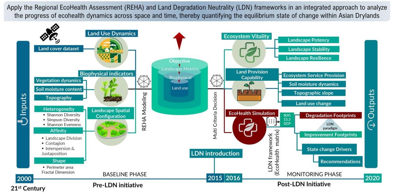 ????針對這一問題,中國科學(xué)院新疆生態(tài)與地理研究所陳亞寧研究員團(tuán)隊(duì)開發(fā)了一套創(chuàng)新的綜合評估框架,首次將區(qū)域生態(tài)健康評估(REHA)模型與“土地退化零增長(LDN)”范式相結(jié)合,對2000年至2020年間亞洲干旱區(qū)的生態(tài)健康演變進(jìn)行了時空量化。研究綜合利用土地利用、土壤水分、植被動態(tài)等多源遙感數(shù)據(jù),詳細(xì)評估了生態(tài)系統(tǒng)的健康狀況,并量化了其退化與改善的“收支”平衡。這一視角突破了以往單純評估退化總量的局限,強(qiáng)調(diào)了監(jiān)測“凈變化”對于實(shí)現(xiàn)LDN政策目標(biāo)的決定性作用,為連接實(shí)證研究與可持續(xù)發(fā)展政策需求提供了關(guān)鍵的數(shù)據(jù)支撐。