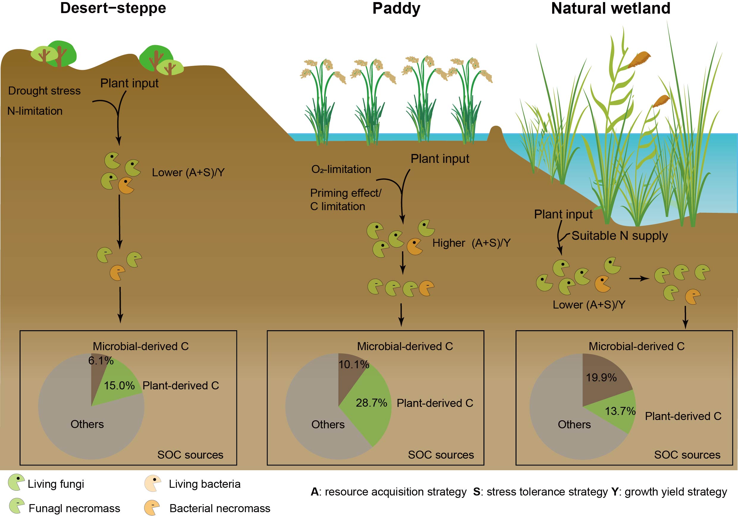 ????研究發(fā)現(xiàn),三類生態(tài)系統(tǒng)SOC積累路徑存在顯著差異。天然濕地SOC含量最高,其中微生物殘體碳占比達(dá)19.9%,并以真菌殘體為主導(dǎo)。該系統(tǒng)中較高的氮磷比緩解了微生物的養(yǎng)分限制,促進(jìn)了以高產(chǎn)策略(Y-策略)為主的微生物群落生長,從而有利于微生物殘體的形成與穩(wěn)定。相比之下,稻田SOC含量最低,其碳庫以植物源碳為主(占28.7%),且易引發(fā)激發(fā)效應(yīng),加劇原有土壤碳的礦化。荒漠草地則因干旱脅迫和養(yǎng)分限制,微生物殘體積累最少,木質(zhì)素氧化程度最高,土壤碳穩(wěn)定性較差。本研究首次在極端干旱區(qū)明確了微生物生活史策略是調(diào)控土壤碳庫穩(wěn)定性的關(guān)鍵,指出天然濕地的保護(hù)對于維持干旱區(qū)碳匯功能至關(guān)重要,而稻田管理需注重控制鹽分與實施氮磷平衡施肥,以促進(jìn)土壤碳的持久固存。