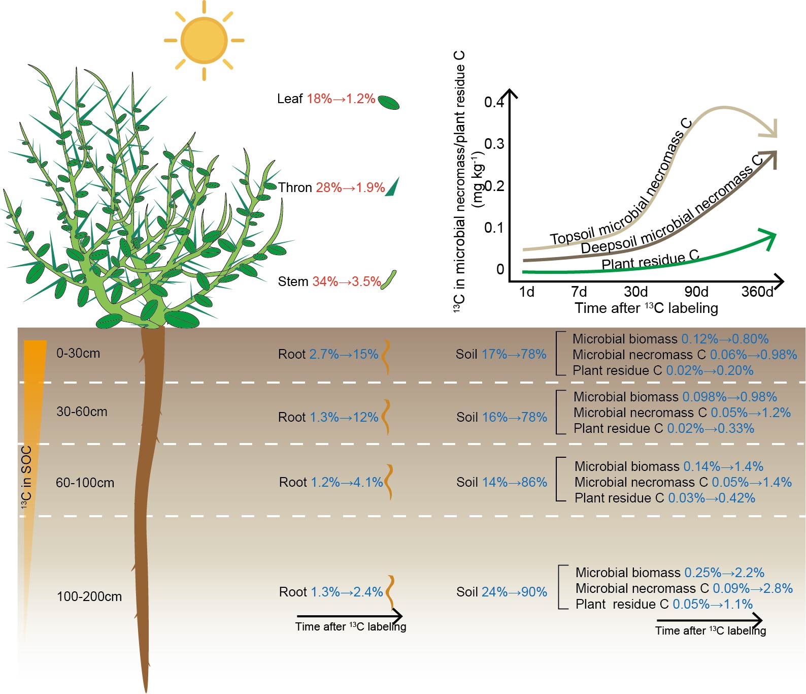 ????在全球干旱區(qū)持續(xù)擴(kuò)張與“雙碳”目標(biāo)推進(jìn)的背景下,深入理解荒漠深根植物光合碳在土壤中的分配與穩(wěn)定機(jī)制,對(duì)提升干旱區(qū)碳匯功能具有重要意義。然而,植物光合碳如何在不同土層中分配,并通過(guò)植物殘?bào)w與微生物殘?bào)w途徑影響土壤有機(jī)碳(SOC)的長(zhǎng)期穩(wěn)定性,仍是當(dāng)前研究的難點(diǎn)。