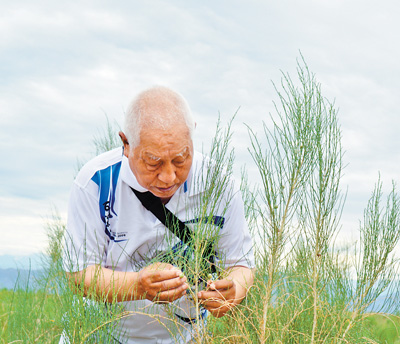????1959年,劉銘庭參加中國科學(xué)院塔克拉瑪干沙漠科學(xué)考察隊,進入荒漠尋找優(yōu)良固沙植物。在一處不起眼的沙丘上,一片紅柳引起他的注意——枝條比較細,很硬、很干,葉子呈細長的針形,抱莖。專業(yè)的敏感讓他意識到這可能是一個新種。后來,這種植物被命名為“塔克拉瑪干檉柳”。此后數(shù)十年間,他相繼發(fā)現(xiàn)了莎車檉柳、塔里木檉柳、金塔檉柳等5個新種,成為中國檉柳家庭四分之一屬種的發(fā)現(xiàn)人和定名人。檉柳是一種生長在荒漠環(huán)境中極為耐旱、耐鹽堿的植物。劉銘庭全身心投入研究紅柳的育苗和造林,經(jīng)過反復(fù)試驗,他將紅柳育種產(chǎn)苗量由每畝5萬株提高到50萬株,扦插育苗的畝產(chǎn)量達到12萬株,在全球領(lǐng)先。