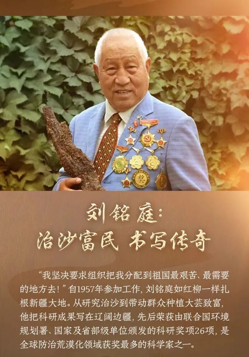 ????劉銘庭在防治荒漠化領(lǐng)域取得顯著成就,其貢獻受到社會各界的廣泛贊揚與高度認可。他先后榮獲由聯(lián)合國環(huán)境規(guī)劃署、國家及省部級單位頒發(fā)的科研獎項共26項,并被聯(lián)合國環(huán)境規(guī)劃署專家組譽為“劉紅柳”。2019年,劉銘庭被授予“最美支邊人物”“最美奮斗者”稱號;他亦是全球防治荒漠化領(lǐng)域獲獎最多的科學(xué)家之一。然而他最珍視的稱號,始終是老百姓口中所說的“紅柳老人”。